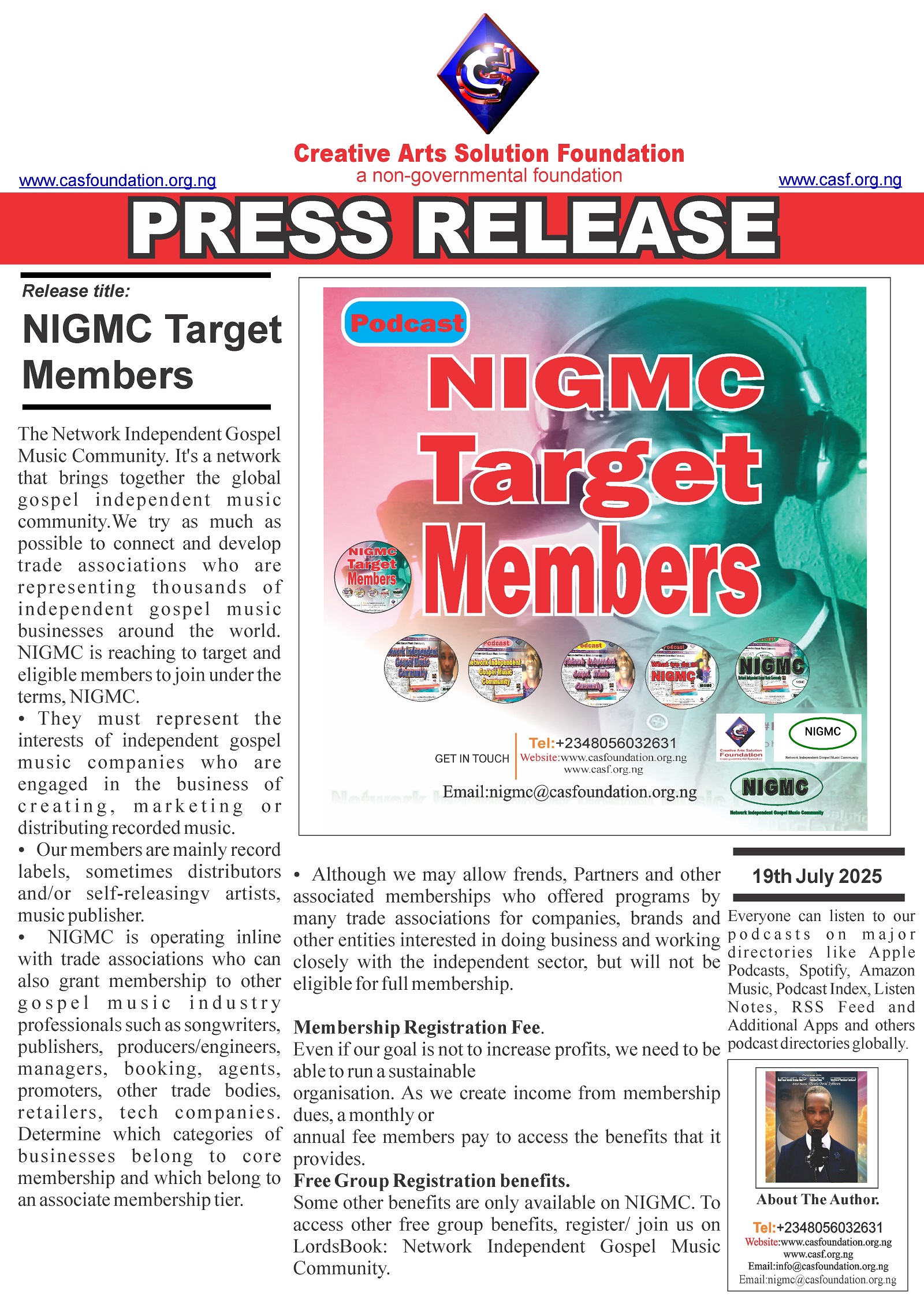 The Chairman of Creative Arts Solution Foundation, Mr Olusola David Ayibiowu has started a Network Independent Gospel Music Community (NIGMC) on July 4th 2025.The network NIGMC is running under Creative Arts Solution